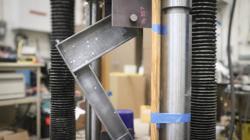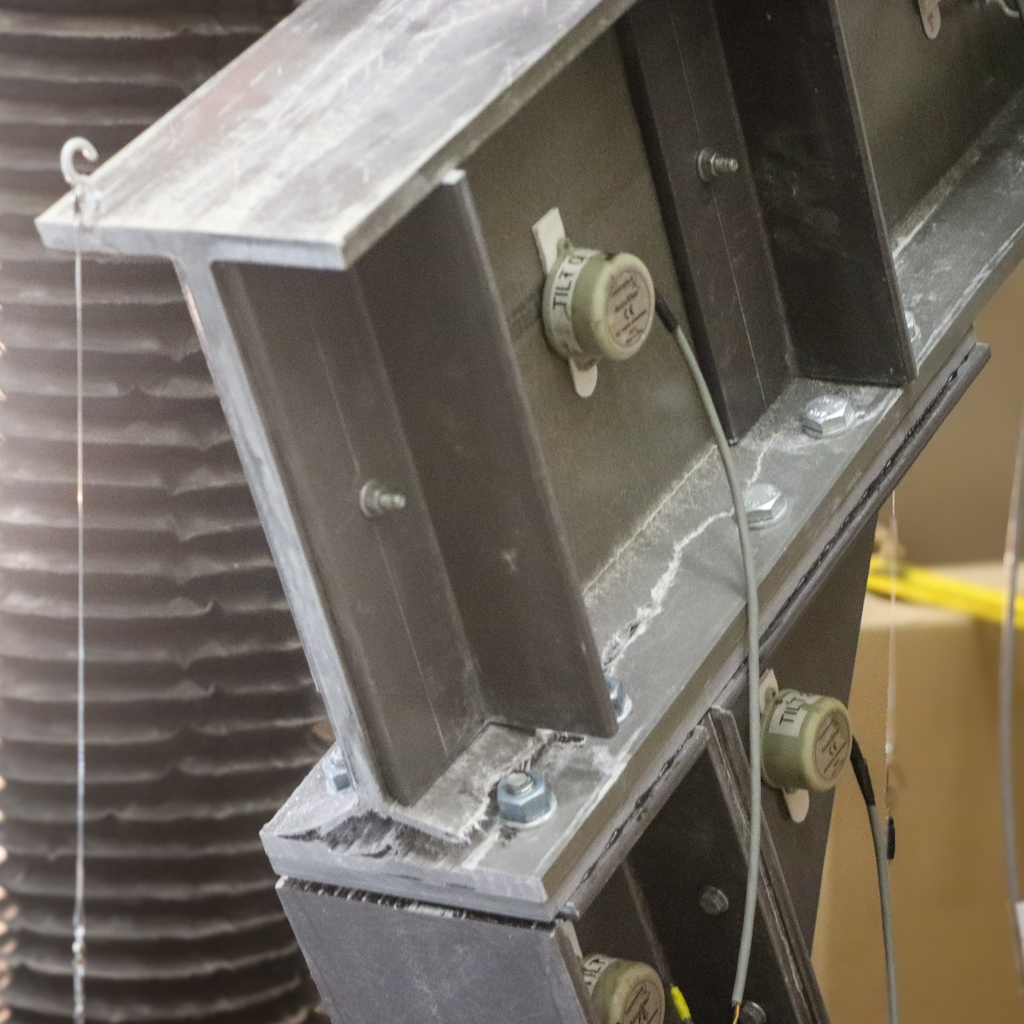 The engineers and researchers tested three unique connection types representing a variety of configuration options and expected performance characteristics. Testing was configured in the ND CEEES Satec universal materials testing machine (which has a 600,000 lb ultimate capacity) in the Structural Systems Laboratory. Displacements and rotations of the specimens were measured in all three dimensions using a system of string potentiometers, linear variable differential transformers (LVDTs), tilt-meters, and state-of-the-art digital image correlation (DIC). The tested connections types and their associated measured performance characteristics were then simulated as part of a prototypical in-service structural frame using finite element modeling software, and the early results are promising enough to conduct additional testing with samples meeting minimal sample size requirements to ensure statistical significance and design reliability. Furthermore, the identified failure modes allow researchers to improve the design for better expected performance in future testing and field applications.