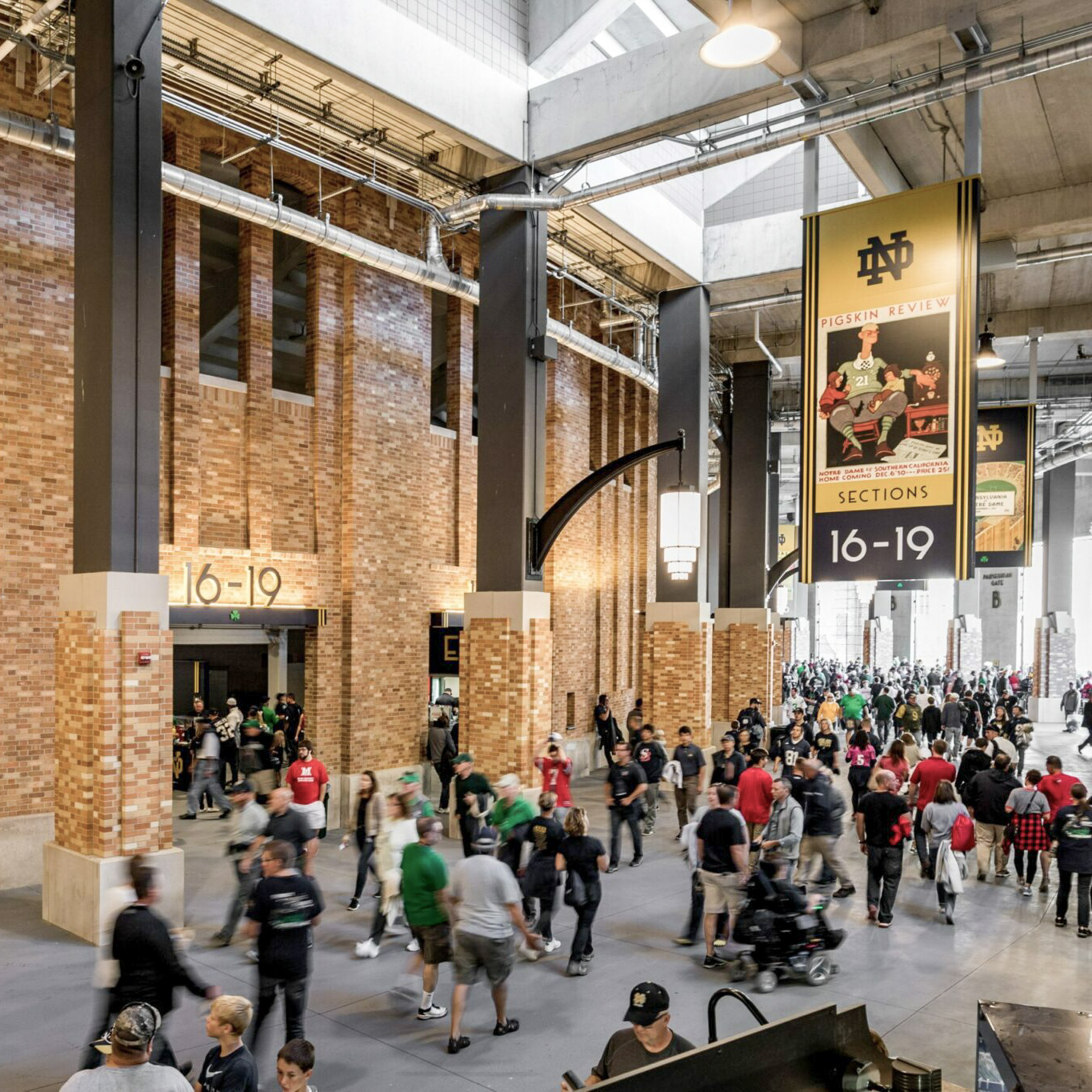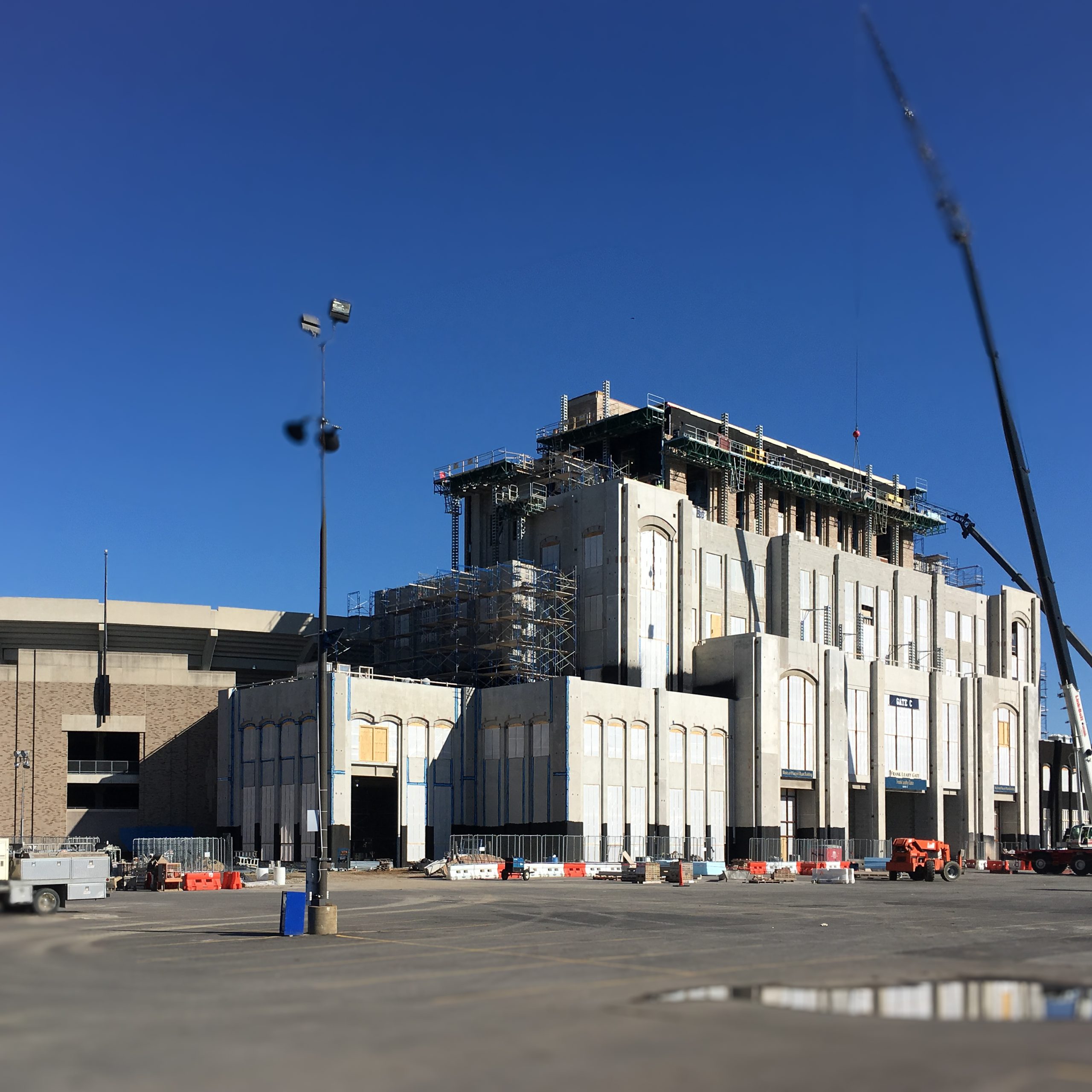 The construction included the addition of approximately 800,000 square feet across three separate new buildings attached to the west, east and south sides of Notre Dame’s historic football stadium.